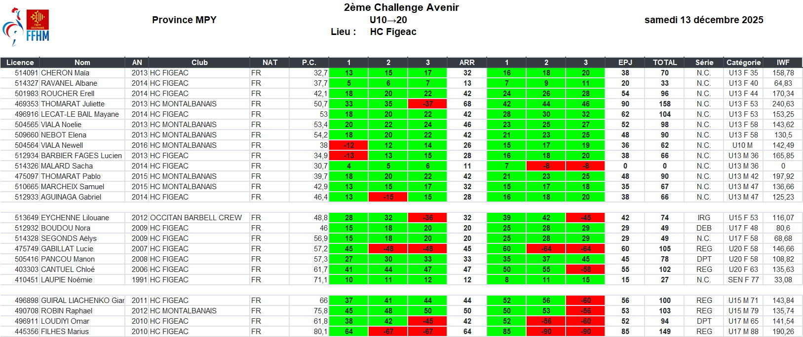 14 Déc2025 admin1776 0Compétition 2ème challenge avenir U10→U20 MPY Organisé par HC Figeac le 2ème challenge avenir a regroupé 24 athlètes dont 13 U10/U13. U10/U13NCDEBDPTREGIRGHC Figeac72 1 24 HC Montalbanais 6 1 Occitan Barbell Crew 1 Total 13 2 1 2 5 1