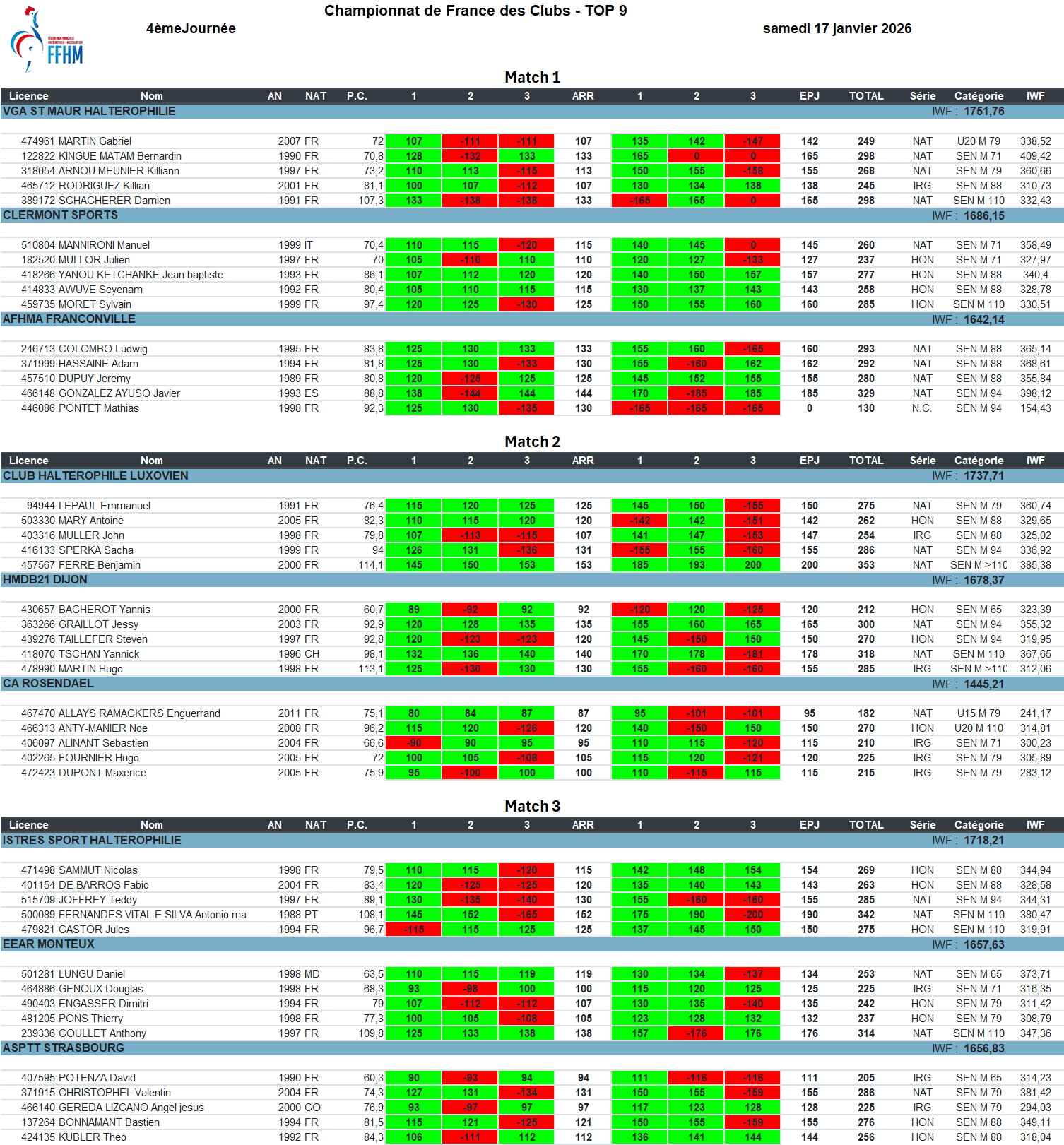 Clermont Sports a réussi son déplacement à Franconville en s’engouffrant à la 2ème place de ce match contre le club local et VGA Saint Maur. En effet Mathias PONTET de l’AFHMA Franconville manquera par 3 fois 165kg à l’épaulé jeté ce qui permet à Clermont Sports qui fait un de ces meilleurs matchs de la saison (1686,15 points contre 1692,39 points à la 2ème journée) de se retrouver 2ème. Ce déplacement aura été tout bénéfice pour le club, il empoche le 2ème place du match et en plus assure son maintien en TOP 9.