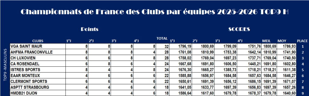 Au classement définitif du championnat de France TOP 9 VGA Saint Maur est premier suivi de AFHMA Franconville 2ème et CH Luxovien 3ème. Clermont Sports se classe 7ème battu au goal-average par Istres Sports et les 2 derniers sont donc ASPTT Strasbourg et HMDB21 Dijon qui vont participer aux montées et descentes avec la nationale1