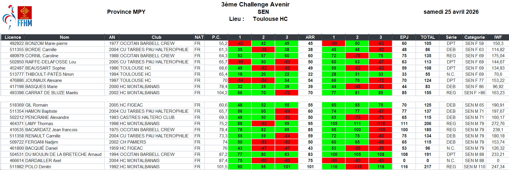26 Avr2026 admin1776 0Compétition 3ème challenge avenir SEN – MPY 20 athlètes ont participé au 3ème challenge avenir séniors au Toulouse HC. 7 clubs étaient présents à cette compétition, 9 féminines et 11 masculins. NCDEBDPTREGCastres HC 1 CH Pamiers 1 CU Tarbes Pau 31 HC Figeac11 HC Montalbanais11 3Occitan Barbell Crew 22Toulouse HC1 2 Total3755