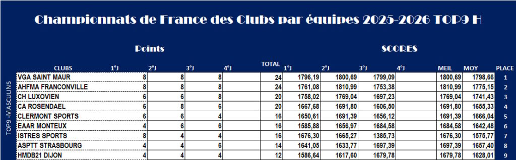 La 3ème journée aura bouleversé le classement général. En effet EEAR Monteux se classe 2ème et dame le pion à Clermont Sports, Istres Sport s’effrondre à la 3ème place dans le 2ème match à Saint Maur. Ainsi au total des points ces 3 clubs sont au coude à coude à la 5ème, 6ème et 7ème place. Tout se jouera donc à la dernière journée où Clermont Sports se déplacera à Franconville pour rencontrer le club local et VGA Saint Maur 1er et 2ème de ce TOP 9.
