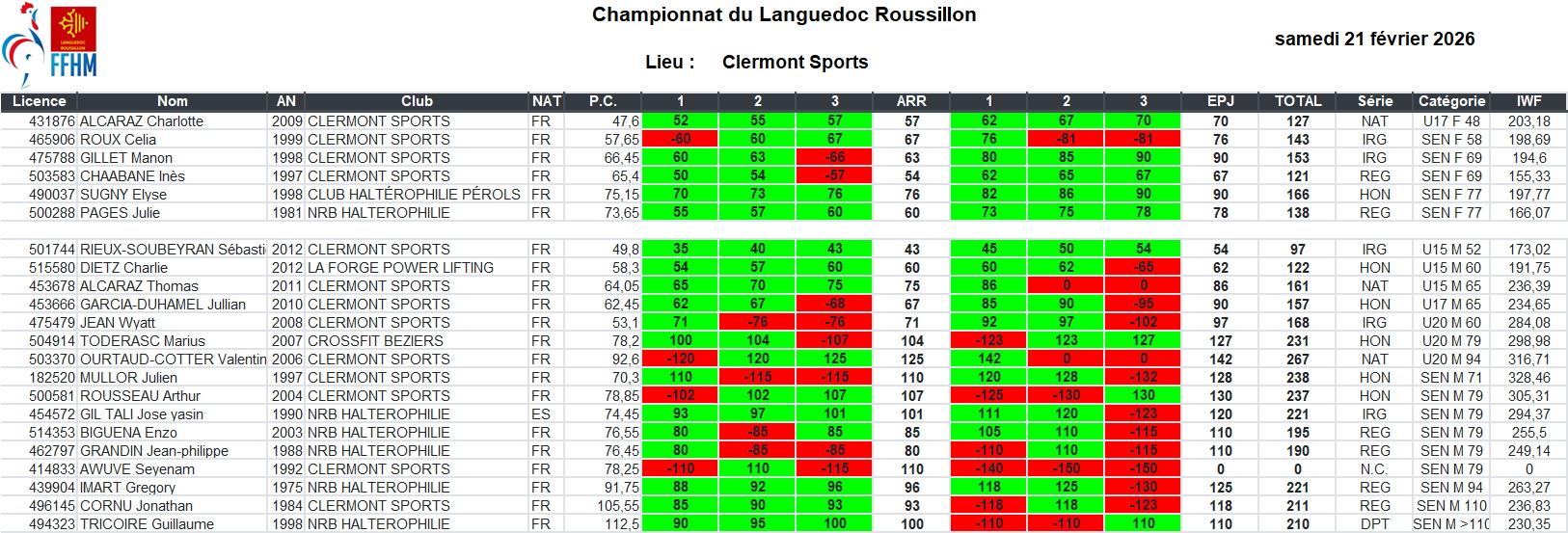 Organisé par Clermont Sports le championnat du Languedoc Roussillon a réuni 22 athlètes dont 6 féminines malgré quelques défections de fin de semaine. 3 athlètes réalisent la série nationale et 6 athlètes la série honneur leur ouvrant les portes des divers championnats de France.